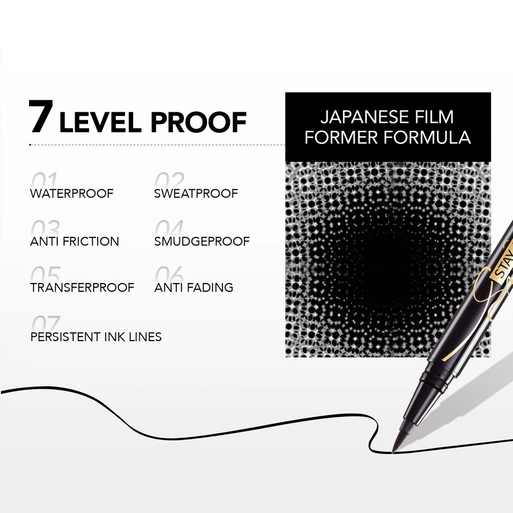 – 7 IN 1 Features Film Former dari Jepang membuat formulanya waterproof, sweatproof, anti friction, smudgeproof, transferproof, anti fading, dan persistent ink lines